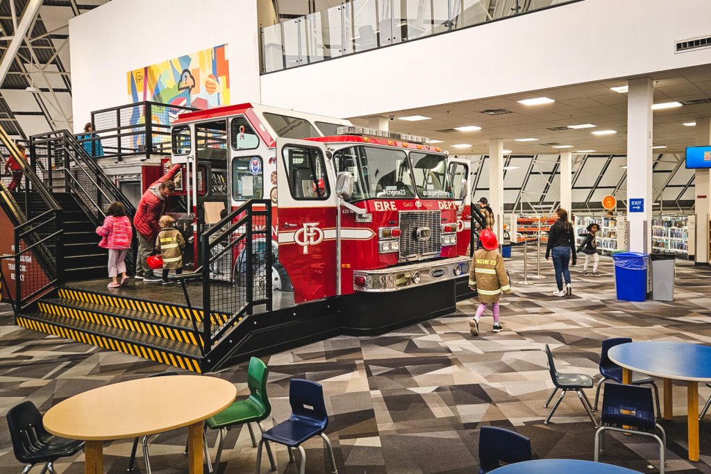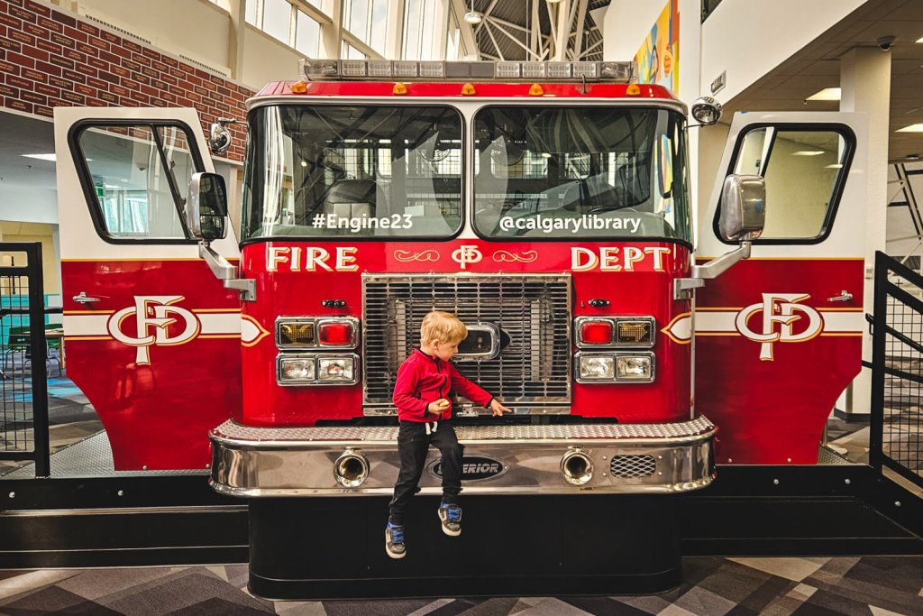 One of our favourites is the Fish Creek Library because of the Engine 23, a decommissioned fire truck that has been moved inside the library. Kids can dress-up as firemen, pretend to drive a firetruck, and push many buttons to turn on the sirens.